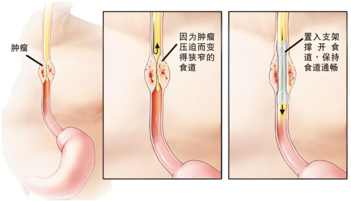 ● 肿瘤压迫食道导致梗阻无法进食:放食道支架保持食道畅通。